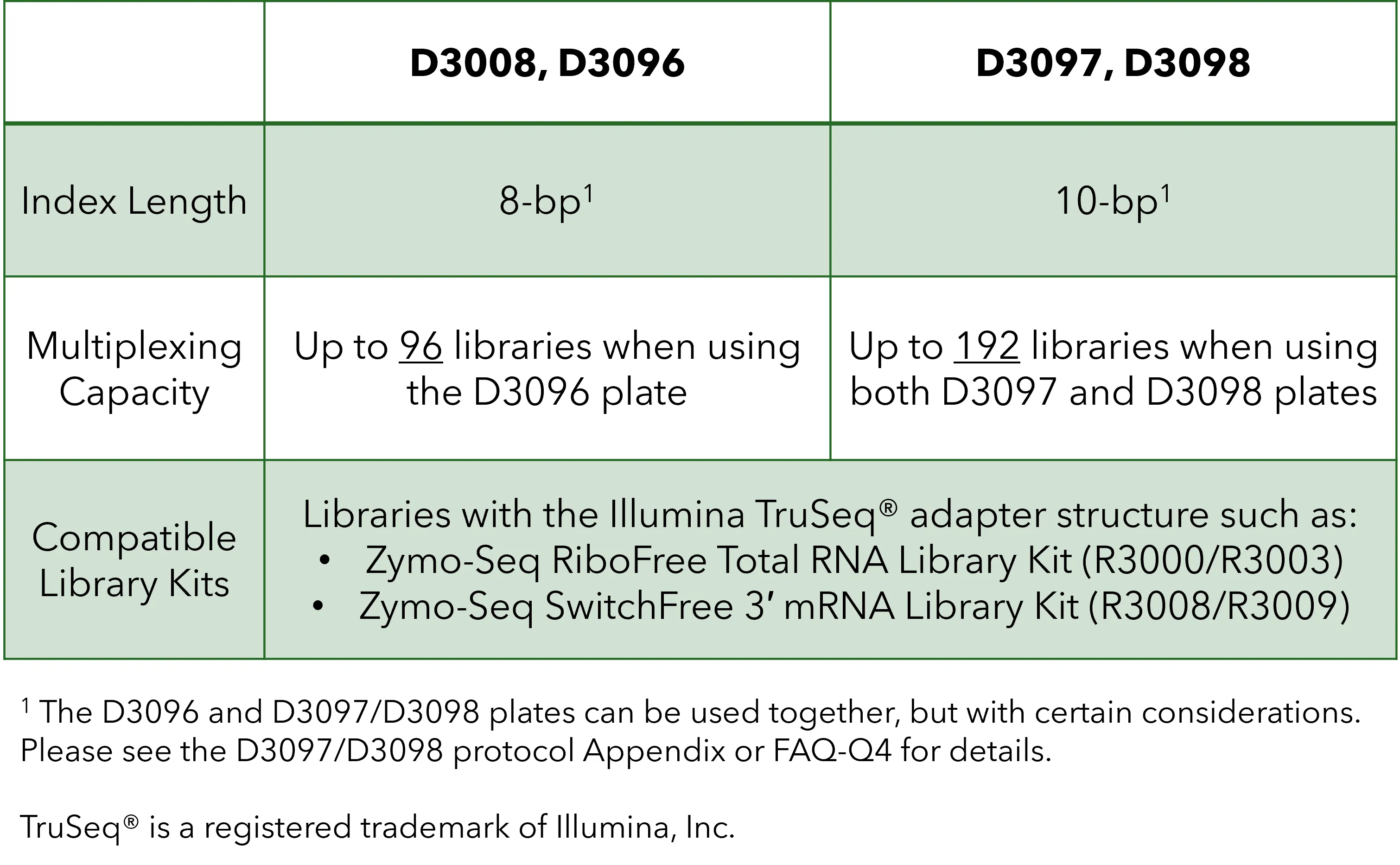 | D3097 | Zymo-Seq UDI Primer Plate (Indexes 1-96, 10-bp) | 96 indexes | |